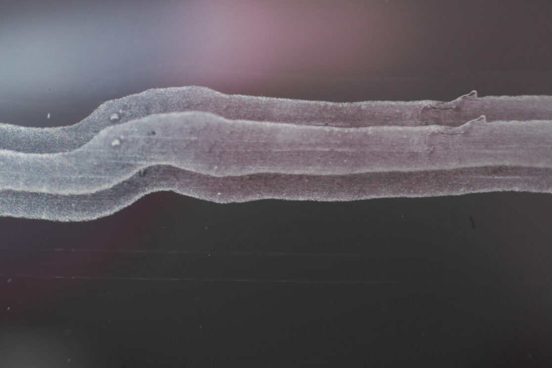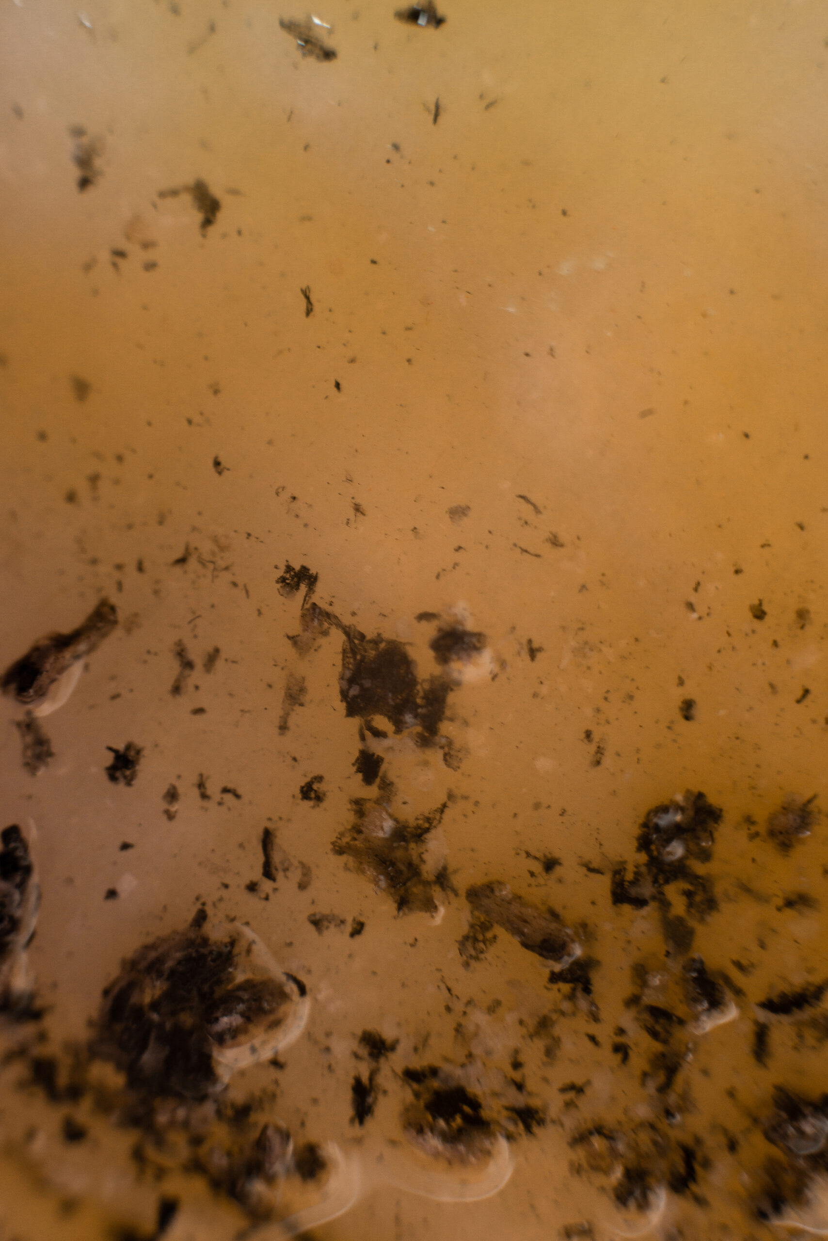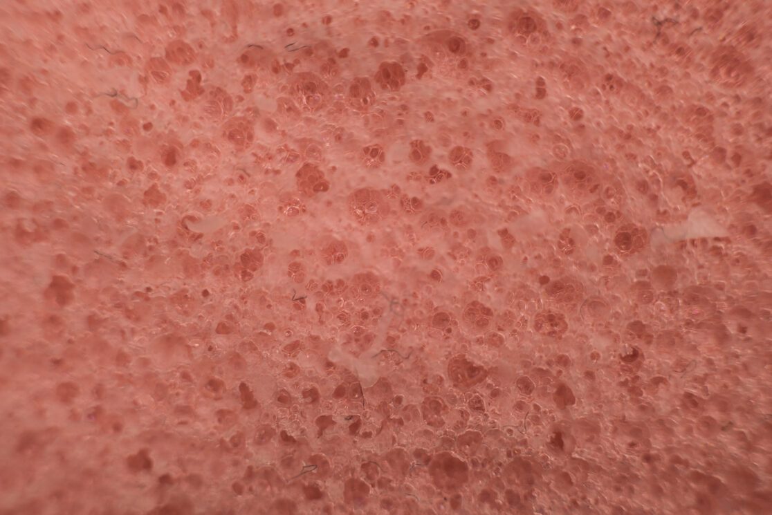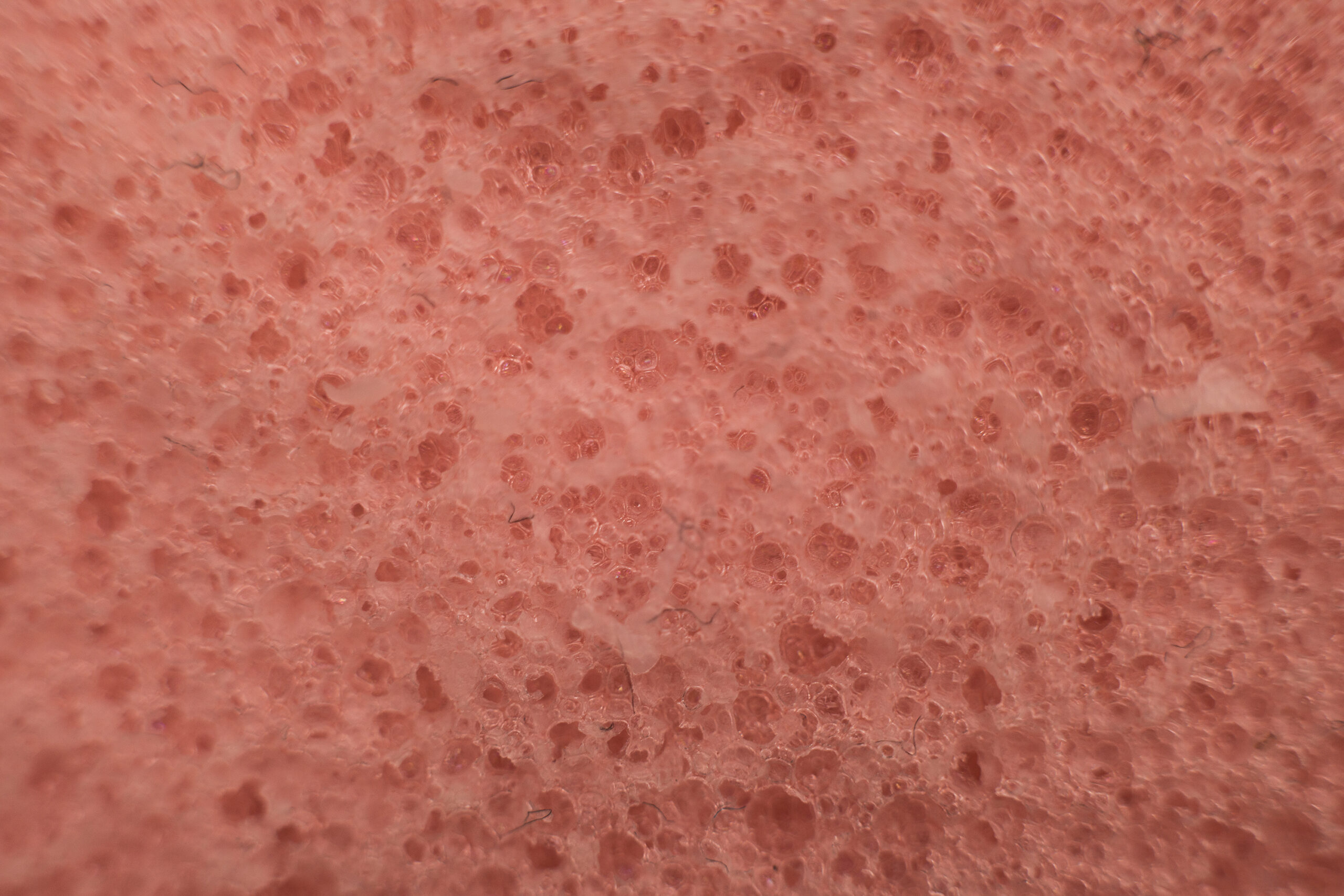 Niepokojące piękno płynów ustrojowych ludzkiego organizmu ukazuje kompleksowość doświadczania atrofii. Resztki pianki do golenia, odcisk palca odbity w tłuszczu czy zacieki śliny na lustrze tworzą zmysłową, poetycką narrację. Estetyka fotografii balansuje na pograniczu surowej, wyrafinowanej abstrakcji i zarazem subtelnie dotyka kategorii abiektu. Cykl gra kontrastami: na jednym ze zdjęć jesteśmy skonfrontowani z porowatą tkanką, która może zarazem budzić wstręt, strach, ale i fascynację. Fotografia obezwładnia i zniewala, krępuje i uwodzi jednocześnie.