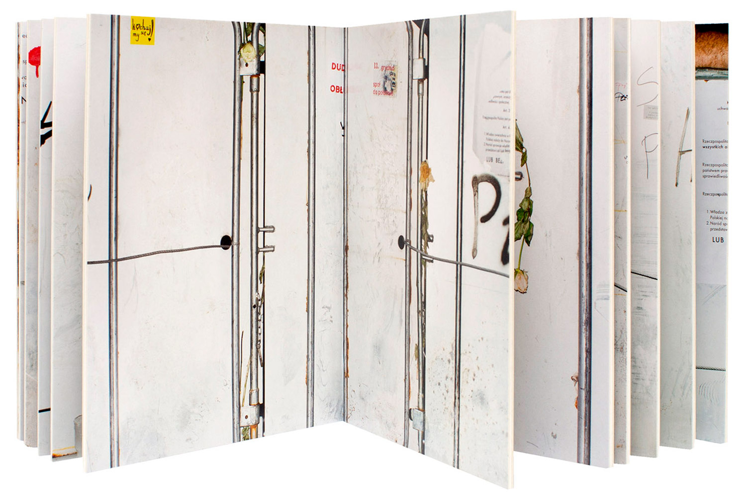 Jednym z przykładów zastosowań formalnych jest publikacja Rafała Milacha – Prawie każda róża na barierkach przy sejmie, którą możemy zobrazować nieszablonowe wykorzystanie formatu książki oraz rodzaj zabawy formą, w pełni odpowiadającą na potrzeby treści. Rafał w swoich projektach opowiada o problemach społecznych, przeznaczonych dla szerszego grona, ludzi niekoniecznie związanymi z polem sztuki.22 Książka Prawie każda róża… jest rozkładającą się, przestrzenną i możliwą do postawienia formą leporello. Staje się mikro architekturą. Takie rozwiązania formalne nie powinny być jedynie dekoracyjne, mogą wówczas przeszkadzać historii.23 Całość została przemyślana tak, aby po rozłożeniu układała się w ciągnący się mur, tworząc rodzaj obiektu. Wybranie publikacji pokazuje, jak można grać formą książki sprawiając, że nie będzie ona tylko kolejnym ciekawie wyglądającym zabiegiem formalnym, ale stanowi odpowiedź na konkretny projekt wpływając na odbiór treści. To książka, której doświadcza się fizycznie i należy zbadać jej strukturę. Warsztat i kreatywność w decyzjach, pozostają w ścisłej zależności.